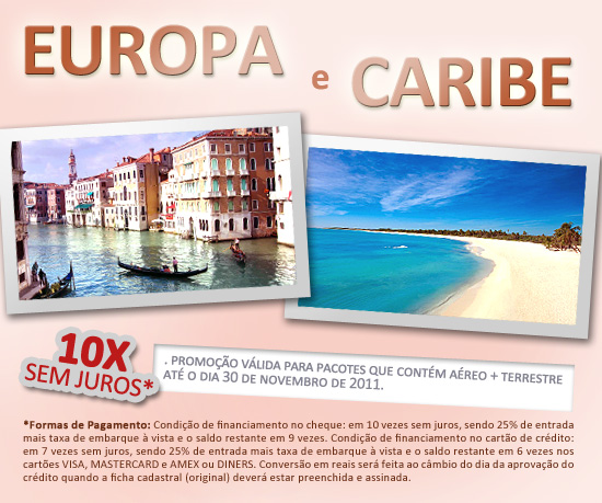 Fantástica Oferta de pacotes para Europa é Caribe , com facilidades de pagamento de até 10X SEM JUROS , atenção esta promoção e válida para Pacotes que contém Aéreo + Terrestre , até o dia 30 de Novembro de 2011 . Veja as condições desta Oferta , e para maiores informações , aguardamos seu contato. Para outros Roteiros de Férias , AQUI.